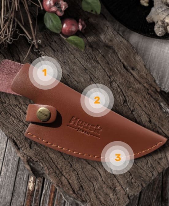 Unsere Messerhüllen wurden mit besonderem Augenmerk auf Schutz entwickelt. Durch die Verwendung von dickem, gepolstertem Leder haben wir sichergestellt, dass Ihre Huusk Messer sicher vor Absplitterungen und Brüchen geschützt sind, egal, wohin Sie sie mitnehmen.